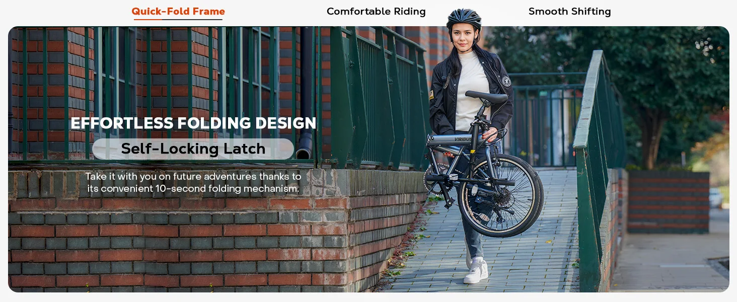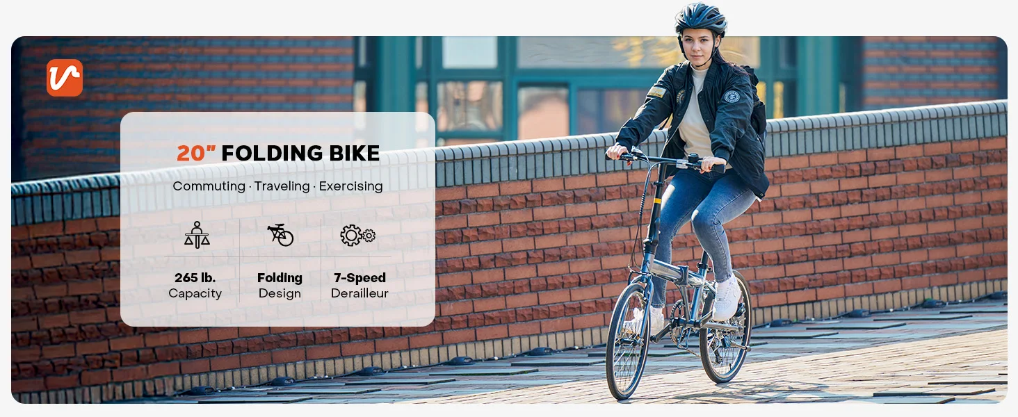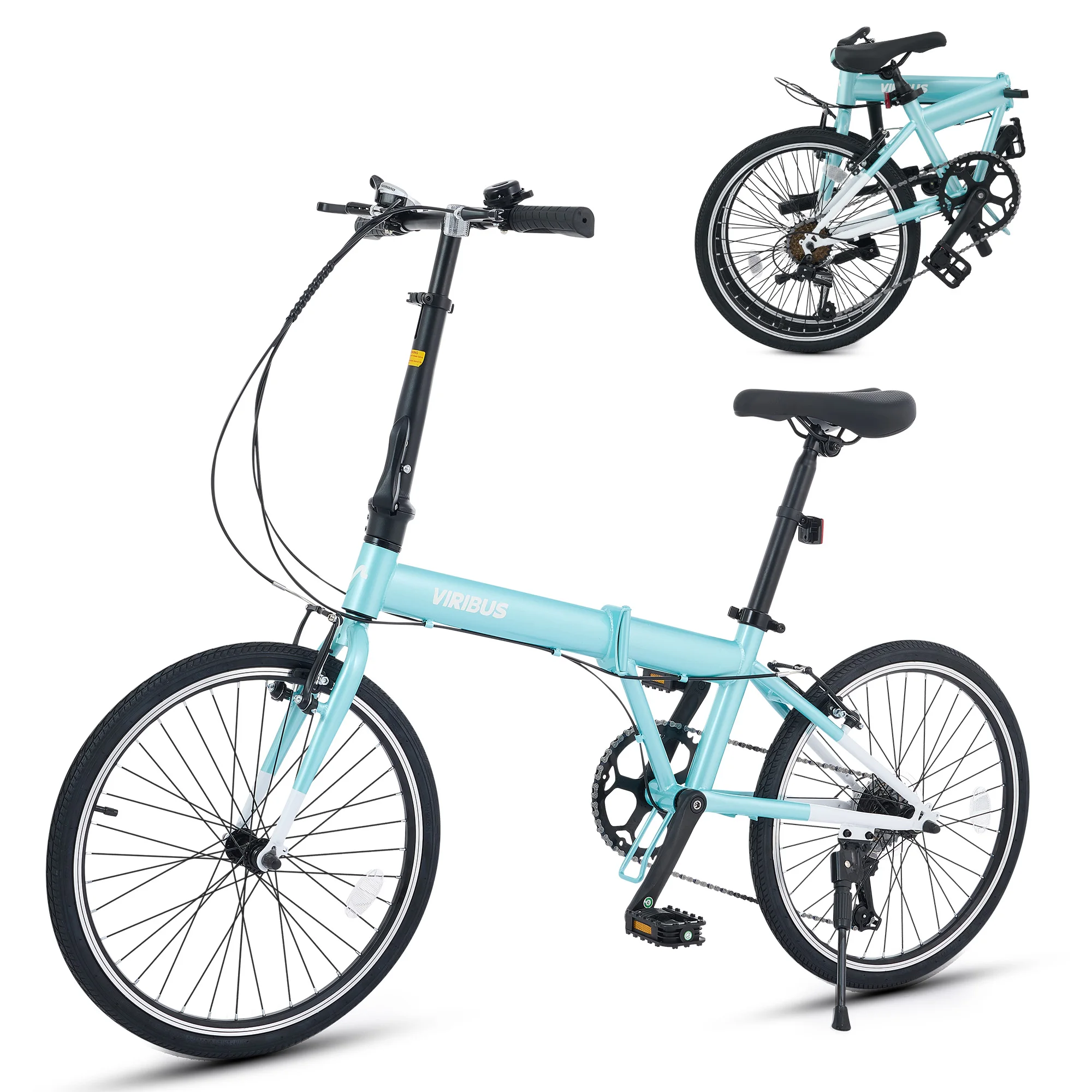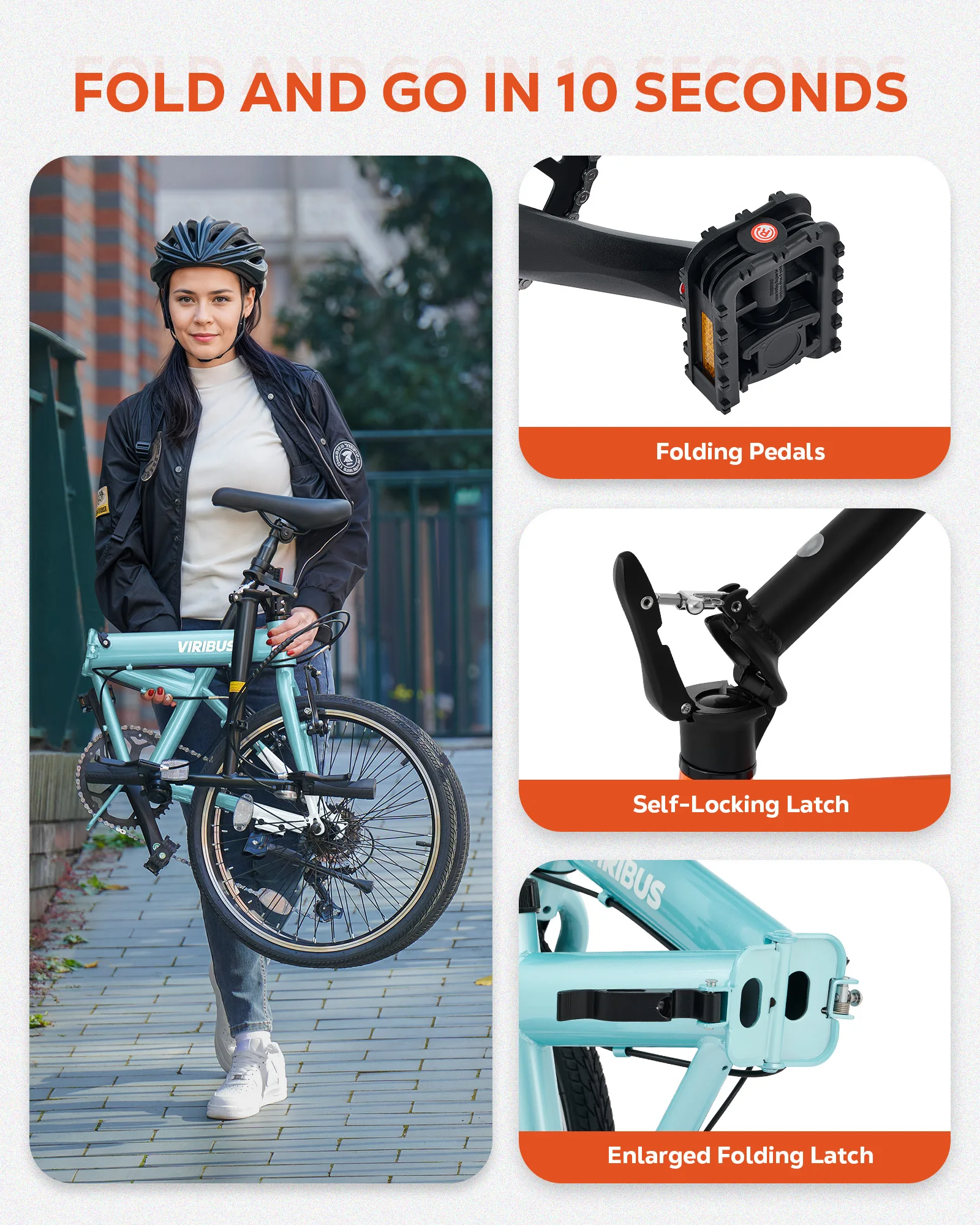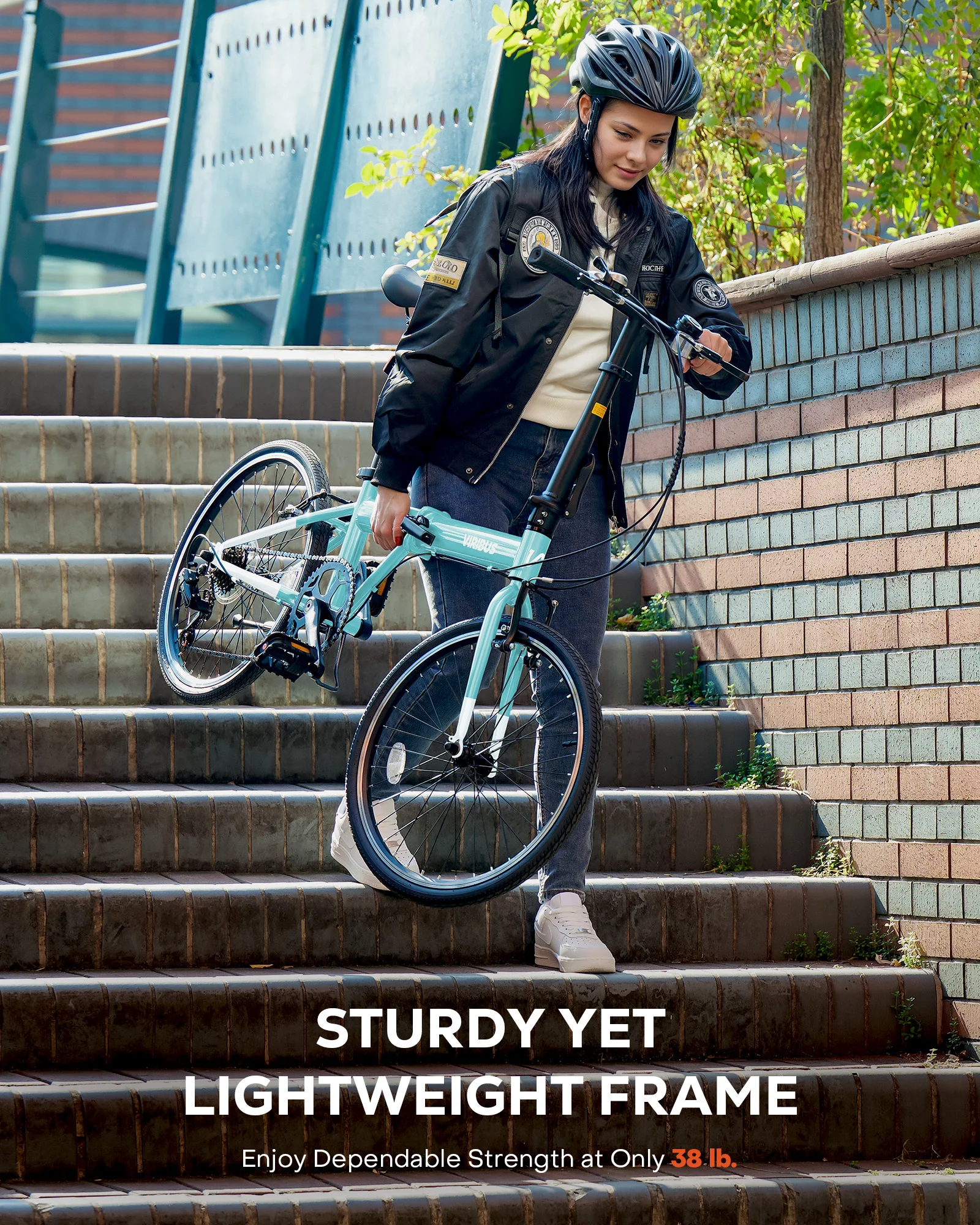 SpecificationsMaterial: Steel, Aluminum, Rubber, Leather, PlasticColor: Slate Blue/Mint/CoralWheel Diameter: 20 in. (50.8 cm)Dimensions: 60 x 21.3 x 45 in. (152x54x114 cm)Pedal Bike Speeds: 7Braking System: Dual V BrakesRec. Rider Height: 4 ft. 9 in.-6 ft. 3 in. (145-190 cm)Weight Capacity: 265 lb. (120 kg)Net Weight: 38 lb. (17.2 kg)Package List1x Folding Bike1x Tool Kit1x Instructions
